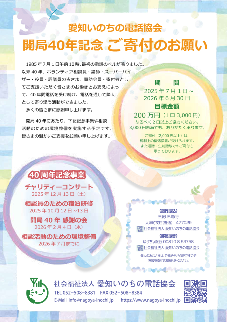 チャリティーコンサートおよび開局40年記念ご寄付のお願い2025年10月30日/カテゴリ: 市民講座・イベント/作成者: wpmaster 40周年寄付pdf 2025チャリコン-f.pdf 2025チャリ−裏-f.pdf 40thチケット-f.pdf https://nagoya-inochi.jp/wp-content/uploads/2022/04/rogo03-300x102.png 0 0 wpmaster https://nagoya-inochi.jp/wp-content/uploads/2022/04/rogo03-300x102.png wpmaster2025-10-30 14:52:432025-10-30 14:55:08チャリティーコンサートおよび開局40年記念ご寄付のお願い